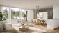 Großflächige Verglasungen prägen das äußere Erscheinungsbild. Im Inneren überzeugen die Grundrisse durch Offenheit und Flexibilität. Raumhohe, breite Fenster lassen das Tageslicht tief in die Wohnräume fluten und schaffen eine luftige, großzügige Wohnatmosphäre.