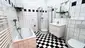Das schwarz-weiß verflieste Badezimmer verfügt auf etwa 7 m² sowohl eine Badewanne, als auch eine Dusche. Ein Handwaschbecken, eine Toilette, die Therme und ein elektrischer Handtuchtrockner (Heizkörper) runden das Angebot ab.