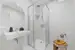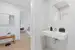 Zur Rechten liegt die Toilette, welche zusätzlich mit einem kleinen Handwaschbecken ausgestattet ist. Das Badezimmer nebenan ist mit einer Dusche, einem Handwaschbecken sowie einen Waschmaschinen-Anschluss versehen. Beide Nassräume sind mit zeitlosen und eleganten Fliesen in warmen beige gehalten, welche zusätzlich über dem Waschbecken einen praktischen Sockel, zum Abstellen von Kosmetika, bilden.