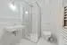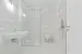 Zur Linken liegt das elegante, mit hellen Fliesen versehene Badezimmer, welches auf 4,49 m² mit einer Dusche, einem Handwaschbecken, einem Waschmaschinen-Anschluss sowie einer Toilette ausgestattet ist.