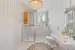 Das Badezimmer nebenan ist mit einer Dusche, einem Handwaschbecken sowie einem Waschmaschinen-Anschluss und einer Toilette ausgestattet und ist in zeitlosem warmen Beige gehalten. Es bietet viel Platz und Stauflächen.