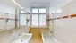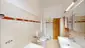 Badezimmer mit Doppelwaschbecken, Dusche, Badewanne und WC sowie zusätzliches WC im Eingangsbereich