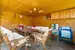 Ein besonderes Highlight ist das charmante Gartenhaus aus Holz, das sich harmonisch in die gepflegte Gartenanlage einfügt. Der Innenraum ist komplett mit hellem Holz verkleidet und liebevoll eingerichtet. Bequeme Sitzmöbel und ein großer Tisch in der Mitte machen das Gartenhaus zu einem perfekten Ort für entspannte Stunden – ob allein mit einem Buch, beim geselligen Abendessen mit Freunden oder beim Spielen mit der Familie.