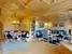 Der Wohnbereich ist mit maßgefertigten Holzmöbeln ausgestattet, darunter eine einzigartige geschwungene Bank mit blauem Bezug und gemütliche Holz Fauteuils. Künstlerische Akzente wie Wandbilder und Skulpturen mit Naturmotiven unterstreichen das alpine Ambiente. Die Küche ist zwar kompakt, aber effizient gestaltet und verfügt über elegante weiße Schränke, moderne Geräte und robuste Steinarbeitsplatten.