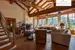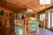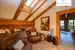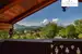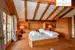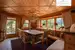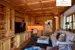Beim Betreten des Chalets werden Sie von einem einladenden Foyer empfangen, das ausreichend Platz für eine Garderobe sowie eine Gästetoilette bietet. Durch die Glastüren des Foyers gelangen Sie in einen lichtdurchfluteten Wohnbereich, der sich durch großzügige Glasfronten und eine beeindruckende Deckenhöhe mit sichtbarem Dachstuhl auszeichnet. Ein Kamin, der in den angrenzenden Essbereich als Kachelofen übergeht, schafft eine behagliche Atmosphäre, besonders an verschneiten Wintertagen. Der Essbereich kann durch eine Schiebetür von der Küche getrennt werden und bietet von beiden Räumen aus Zugang zur herrlichen Sonnenterrasse. Im Erdgeschoss befindet sich außerdem ein Büro, das ebenfalls Zugang zu einem weiteren Außenbereich bietet.