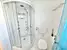 ein modernes Badezimmer mit WC, luxuriöse Dusche, Waschmaschine und Fenster,