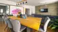 Der große Wohn- und Essbereich mit hochwertigem Parkettboden, stilvoller Steinwand und geschmackvoller Beleuchtung schafft ein Ambiente, das sowohl repräsentativ als auch gemütlich ist. Hier lassen sich Alltag und Entspannung perfekt vereinen.