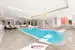 Das Herzstück des Anwesens bildet der rund 150 Quadratmeter große Wellnessbereich. Er umfasst einen Indoor-Pool mit Salzwasser und Gegenstromanlage, Whirlpool, Dampfsauna und Infrarotsauna. Eine integrierte Farblichttherapie in den Saunen und im Poolbereich sorgt für entspannende und wohltuende Wellnessmomente. Die angrenzende Sonnenterrasse mit Naturteich und Wasserfall lädt zu erholsamen Stunden in vollkommener Ruhe ein und bietet einen exklusiven Rückzugsort.